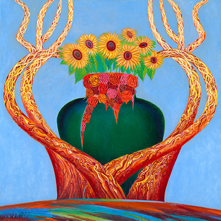 The Broken Vase lies shattered upon the altar of fate, a vessel torn asunder by the unseen hand of destiny. Yet within its fractured shell bloom crimson roses, radiant and unyielding, defying the chaos around them. Behind them, a sea of golden sunflowers rises like a blazing dawn, their light bearing witness to the restless anxieties of mortal hearts, to the fierce devotion and tender fears we hold for those we love. From the wreckage, flames surge and writhe—tongues of fire that consume, that judge, that mark the hour when souls are tested in the crucible of suffering. And still—the roses endure, unscathed, unbroken, eternal. They proclaim a truth etched into the bones of existence: though the heart may splinter, though the world may fall to ruin, the spirit rises—whole, defiant, a timeless force of unity, harmony, and radiant, indomitable grace.